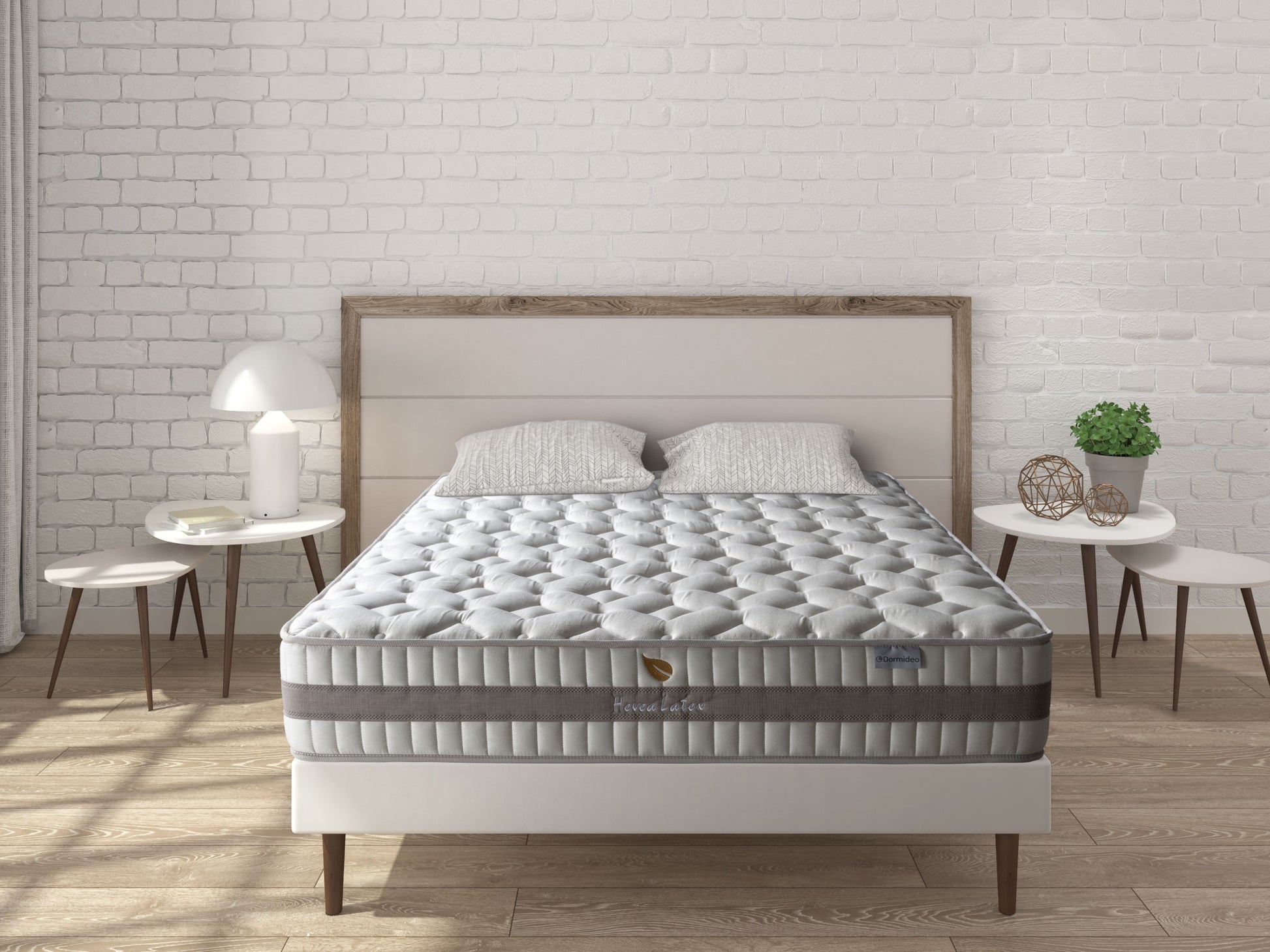 - Colchón ibrido, fusione tra natura e industriale. Il lato su cui si dorme contiene materiali naturali: tessuto in lino + viscosa e uno strato di lattice; il lato opposto contiene il nucleo in schiuma e imbottitura in tessuto stretch. In questo modo si sfruttano i vantaggi di tutti i materiali: comfort naturale ma con una base sintetica per essere meno sensibili alle condizioni ambientali: umidità, ossigeno, luce solare, ecc.